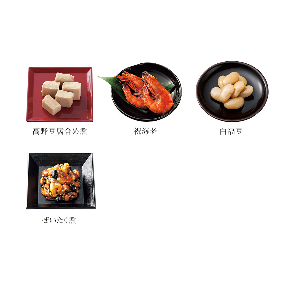 田作り(20g)、丹波黒黒豆(60g)、お煮〆め(100g)、にしん一口巻昆布(6本)、穂先竹の子(2切)、なます(50g)、高野豆腐含め煮(6切)、祝海老(2尾)、白福豆(75g)、ぜいたく煮(50g)