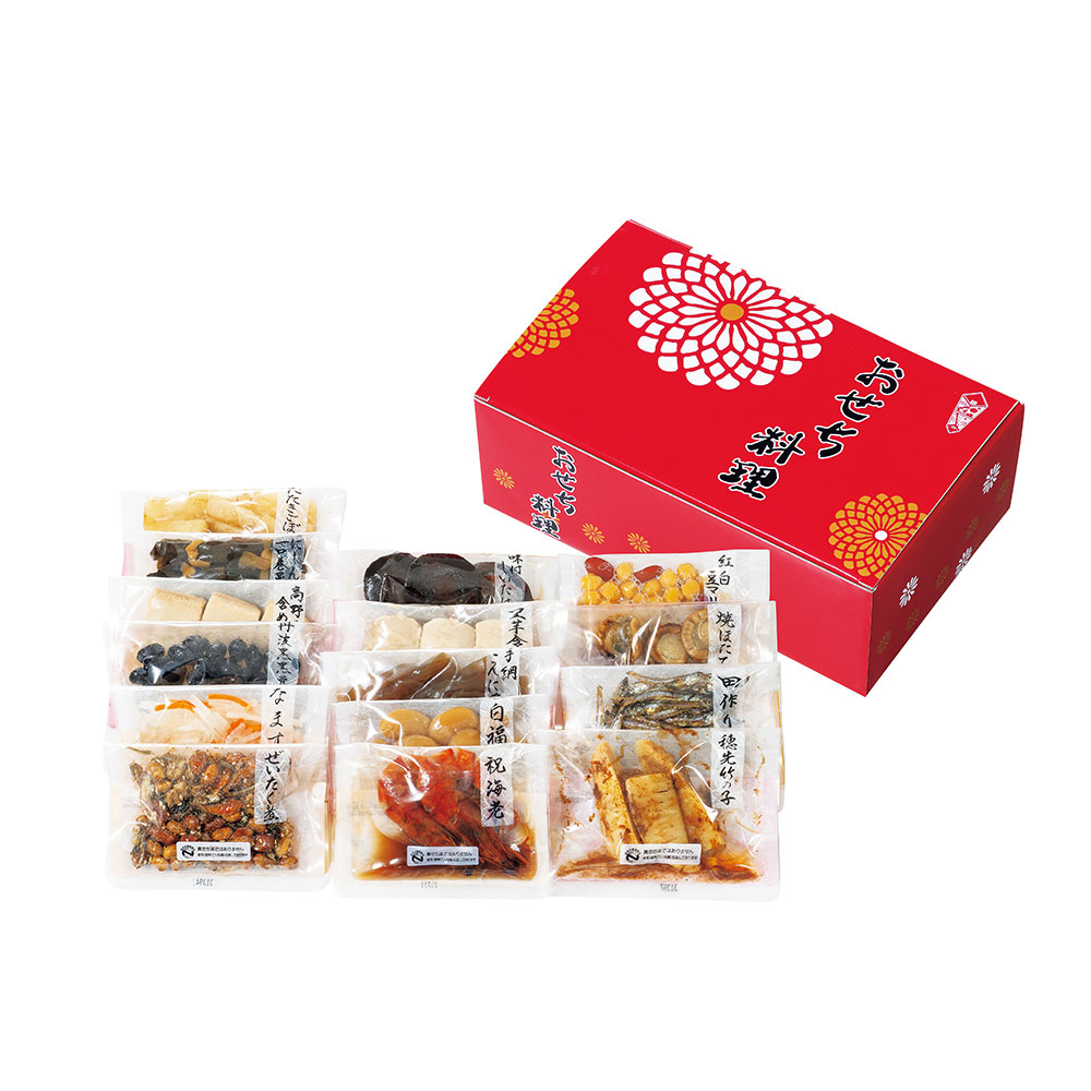 田作り(20g)、丹波黒黒豆(60g)、里芋含め煮(3個)、たたきごぼう(70g)、にしん一口巻昆布(6本)、味付しいたけ(3枚)、穂先竹の子(3切)、なます(50g)、焼ほたて(小)(3個)、手綱こんにゃく(3切)、高野豆腐含め煮(6切)、祝海老(2尾)、紅白豆マリネ(65g)、白福豆(75g)、ぜいたく煮(50g)