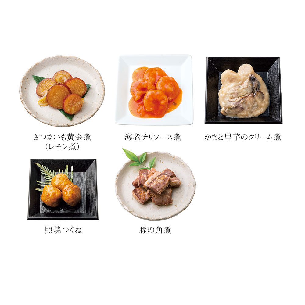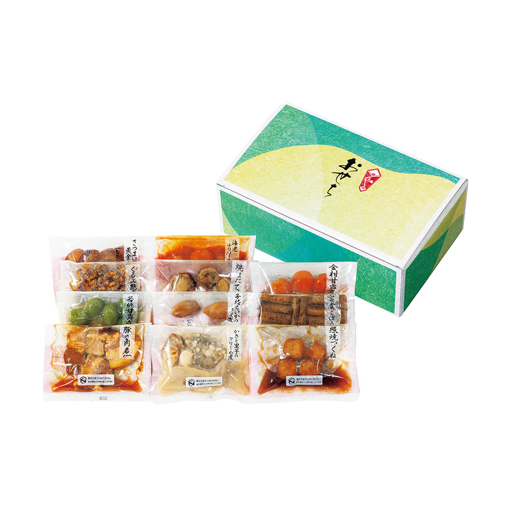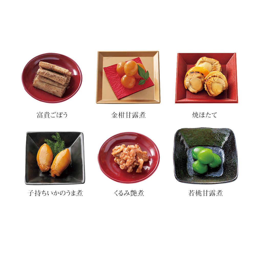 富貴ごぼう(50g)、金柑甘露煮(70g)、焼ほたて(3個)、子持ちいかのうま煮(2個)、くるみ艶煮(35g)、若桃甘露煮(5個)、さつまいも黄金煮(レモン煮)(80g)、海老チリソース煮(4尾)、かきと里芋のクリーム煮(85g)、照焼つくね(60g)、豚の角煮(65g)