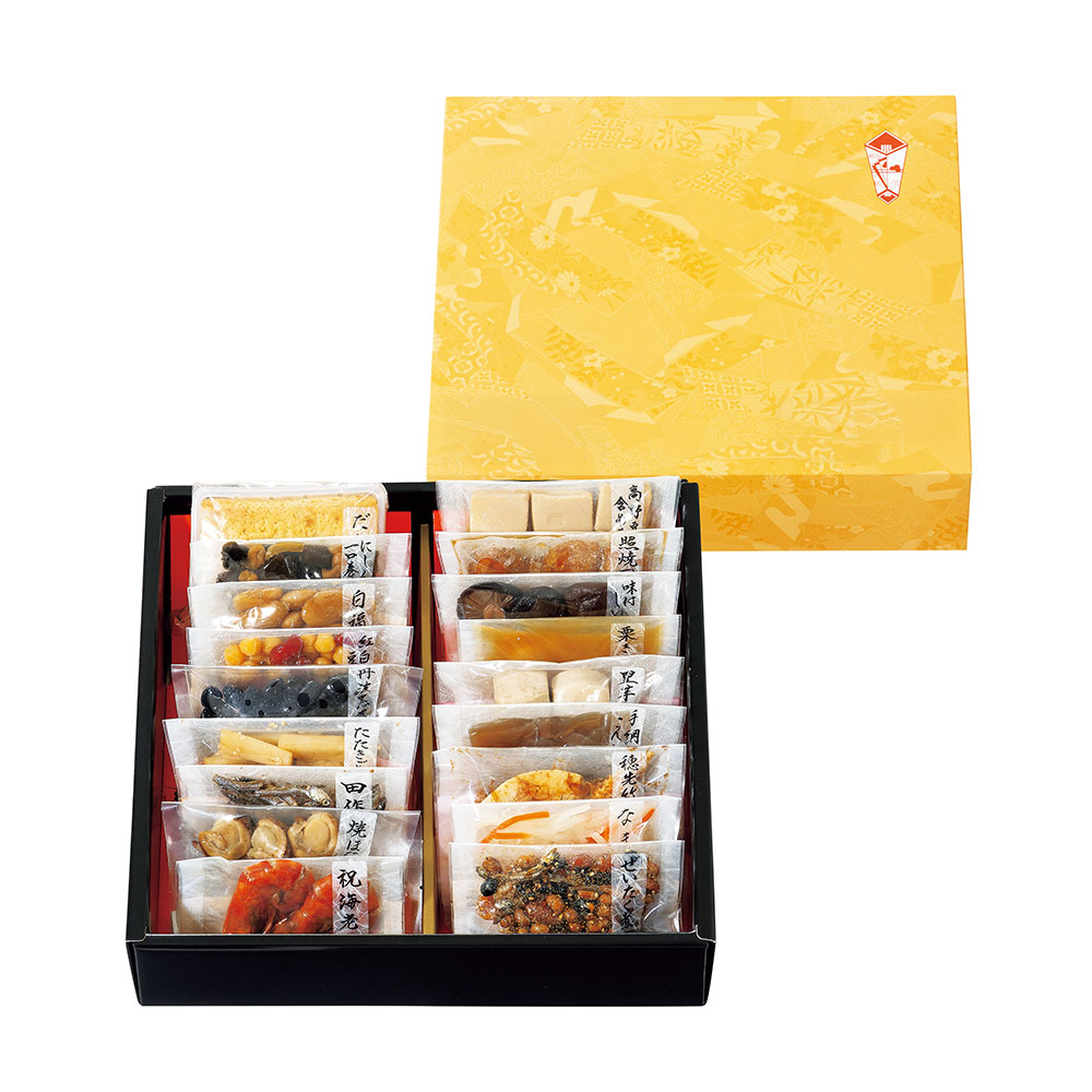 田作り(20g)、丹波黒黒豆(60g)、里芋含め煮(3個)、たたきごぼう(70g)、にしん一口巻昆布(6本)、栗きんとん(70g)、味付しいたけ(3枚)、穂先竹の子(3切)、なます(50g)、焼ほたて(3個)、だし巻(150g)、手綱こんにゃく(3切)、高野豆腐含め煮(6切)、祝海老(2尾)、紅白豆マリネ(65g)、白福豆(75g)、照焼つくね(60g)、ぜいたく煮(50g)