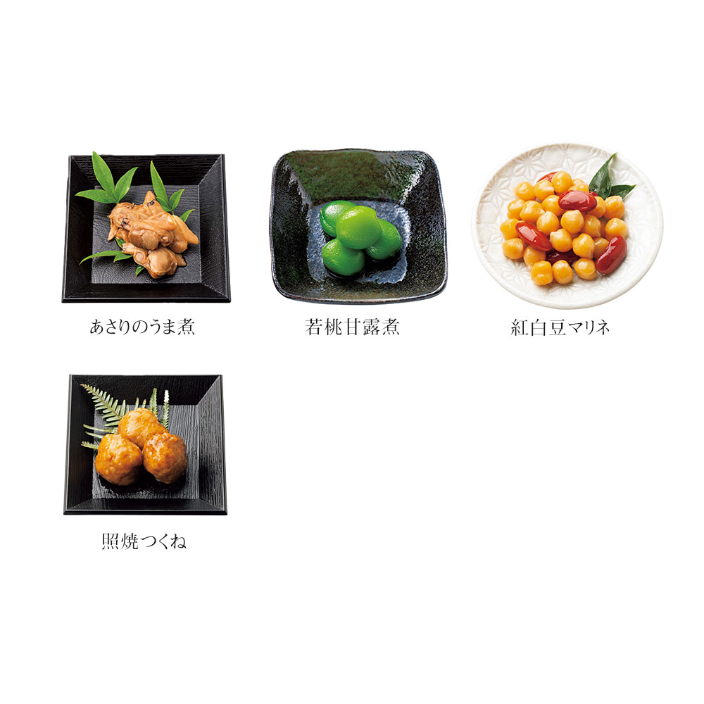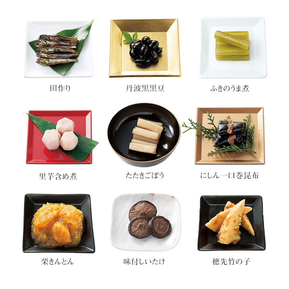 田作り(20g)、丹波黒黒豆(60g)、ふきのうま煮(50g)、里芋含め煮(4個)、たたきごぼう(70g)、にしん一口巻昆布(6本)、栗きんとん(70g)、味付しいたけ(5枚)、穂先竹の子(3切)、なます(50g)、真たらこ角煮(70g)、鰆の柚庵焼(2切)、焼ほたて(小)(3個)、子持ちいかのうま煮(3個)、だし巻(150g)、手綱こんにゃく(4切)、高野豆腐含め煮(6切)、祝海老(3尾)、あさりのうま煮(60g)、若桃甘露煮(5個)、紅白豆マリネ(65g)、照焼つくね(60g)