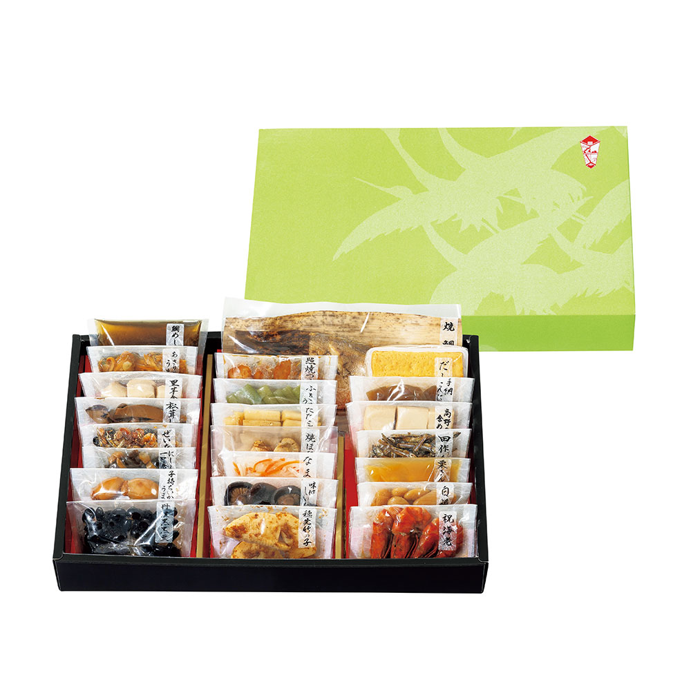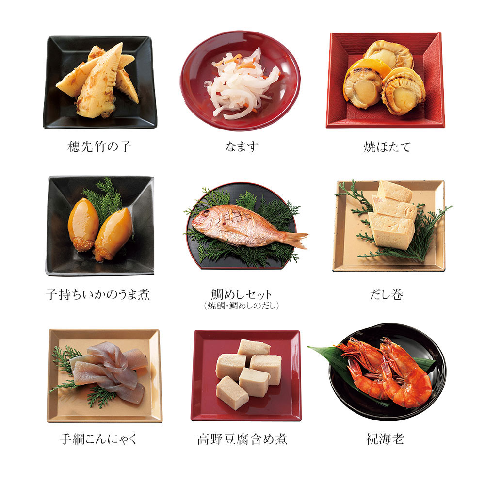 田作り(20g)、丹波黒黒豆(60g)、ふきのうま煮(50g)、里芋含め煮(3個)、たたきごぼう(70g)、にしん一口巻昆布(6本)、松茸しぐれ(40g)、栗きんとん(70g)、味付しいたけ(5枚)、穂先竹の子(3切)、なます(50g)、焼ほたて(3個)、子持ちいかのうま煮(2個)、鯛めしセット(焼鯛1尾、鯛めしのだし150g)、だし巻(150g)、手綱こんにゃく(3切)、高野豆腐含め煮(6切)、祝海老(3尾)、あさりのうま煮(60g)、白福豆(75g)、照焼つくね(60g)、ぜいたく煮(50g)