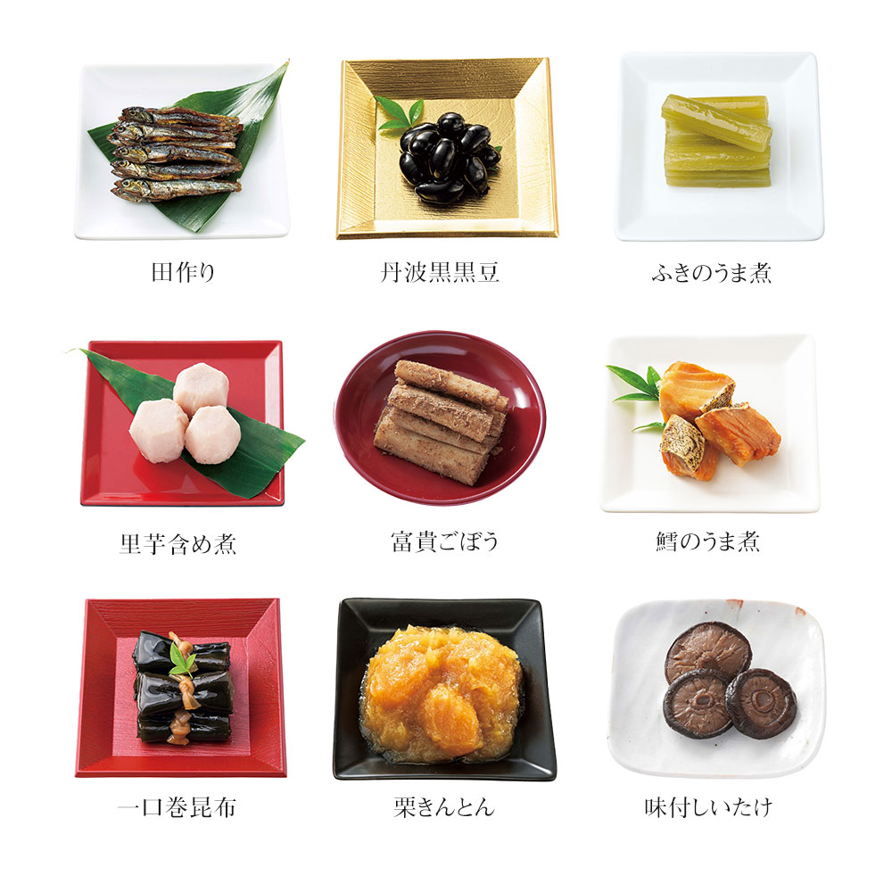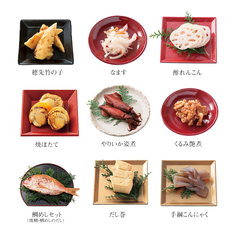 田作り(20g)、丹波黒黒豆(60g)、ふきのうま煮(50g)、里芋含め煮(4個)、富貴ごぼう(50g)、鱈のうま煮(60g)、一口巻昆布(6本)、栗きんとん(100g)、味付しいたけ(5枚)、穂先竹の子(3切)、なます(50g)、酢れんこん(70g)、焼ほたて(4個)、やりいか姿煮(3匹)、くるみ艶煮(35g)、鯛めしセット(焼鯛1尾、鯛めしのだし150g)、だし巻(150g)、手綱こんにゃく(4切)、梅人参(3切)、高野豆腐含め煮(6切)、祝海老(3尾)、イセエビの姿蒸(ミナミイセエビ使用)(1尾)、あさりのうま煮(60g)、若桃甘露煮(5個)、紅白豆マリネ(65g)、白福豆(75g)、紫福豆(珈琲味)(75g)、牛肉ときのこの赤ワイン煮(70g)、照焼つくね(60g)、鶏の照焼(100g)、豚の角煮(65g)