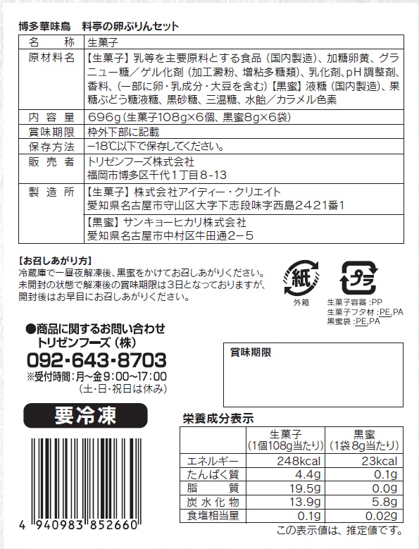 生菓子:乳等を主要原料とする食品(国内製造)、加糖卵黄、グラニュー糖/ゲル化剤(加工澱粉、増粘多糖類)、乳化剤、pH調整剤、 香料、(一部に卵・乳成分・大豆を含む)